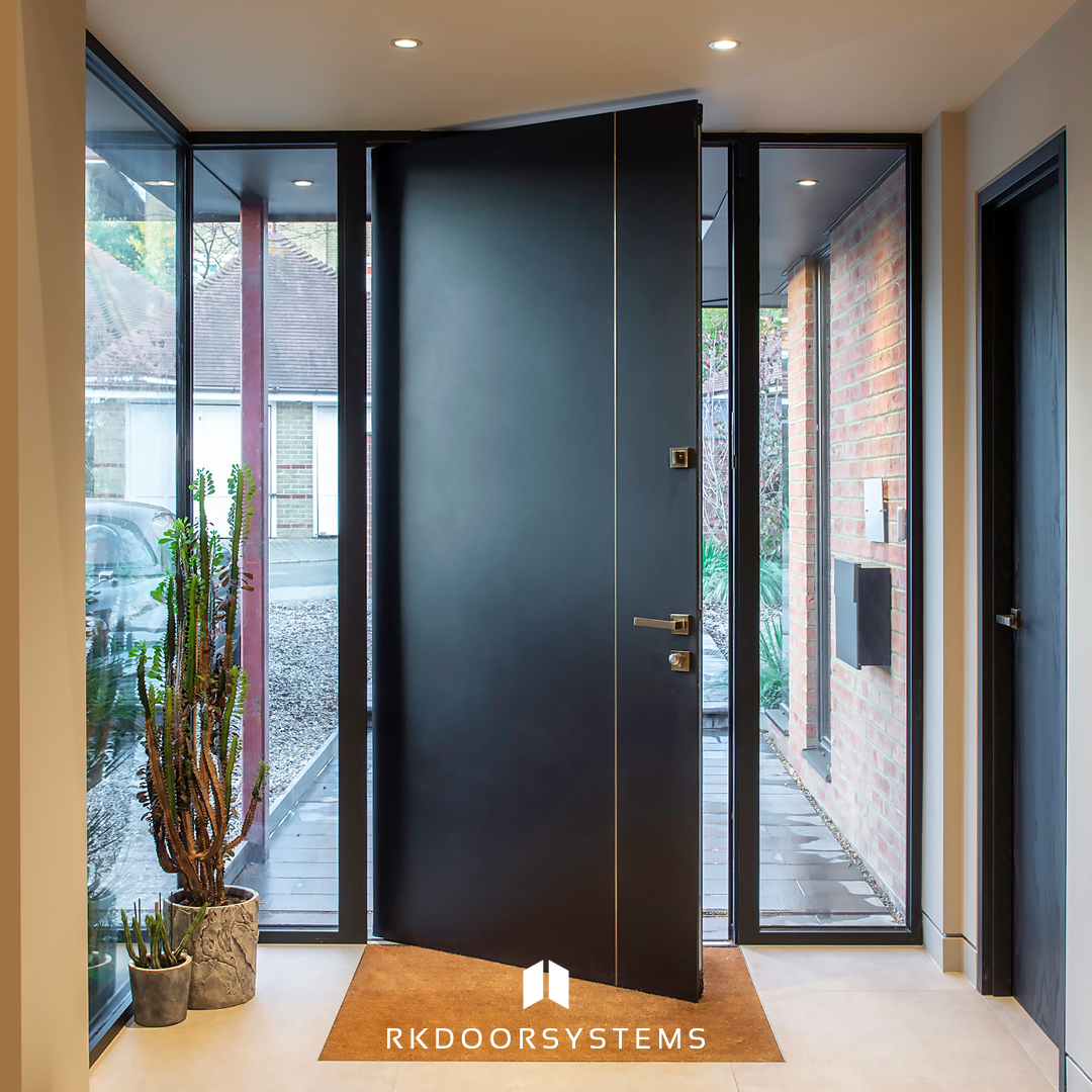 RK Door Systems, RK Steel, Reynaers. Engineered in Germany. Installed by us. Every entrance is a statement — from oversized pivot doors to Crittall-style steel partitions.